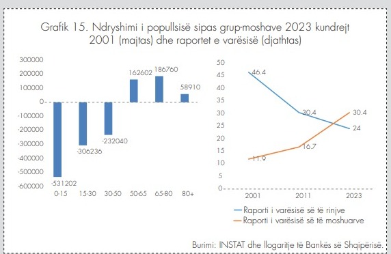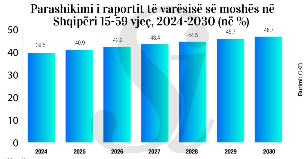Për 2024-s, ky raport, parashikohet 39.5%. OKB parashikon që deri në fund të vitit 2030, ky raport do të jetë 46.7%, pra me një rritje të fortë të moshës madhore, kundrejt të rinjve.
