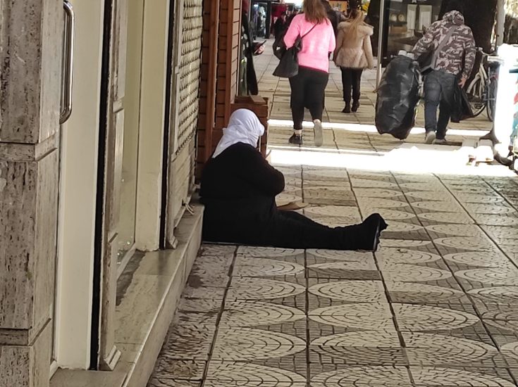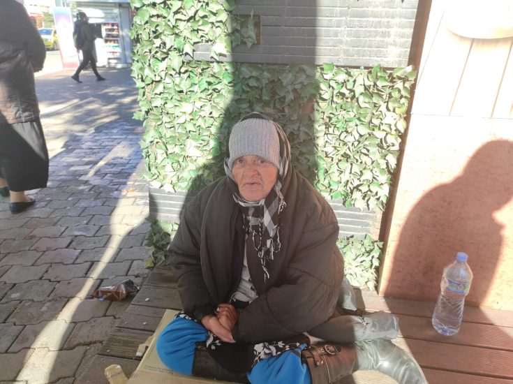 Me cepin e shamisë mbulon pak sytë, ndërsa në anë majtë ka çantën që gjithmonë e ka me rroba. Askush s’ia di historinë sepse nuk flet kur e pyet por çudia është se vendi ku lyp është përballë njé mense sociale, por ajo nuk lëviz prej vendit.