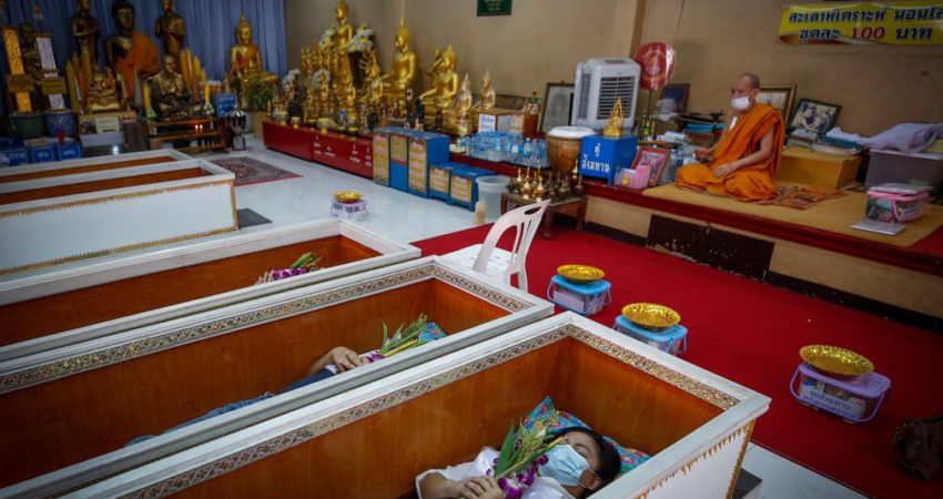 Një tempull budist në periferi të Bangkokut mban çdo ditë funerale live, ku adhuruesit Tailandezë shtrihen brenda arkivoleve duke shpresuar të shpëtojnë veten nga fati i keq dhe të tërheqin fat të mirë. Njerëzit zgjedhin të marrin pjesë në ritual duke ndjekur rekomandimin e një fallxhori.\The Guardian\