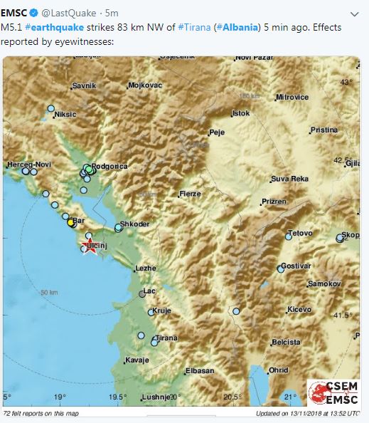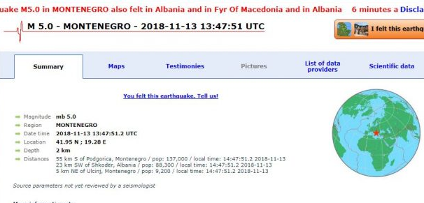 Një tërmet i fortë është ndjerë në qytetin e Shkodrës. Ndërsa lëkundjet janë ndjerë në Tiranë. Sipas të dhënave të Qendrës Sizmike të Europës, EMSC tërmeti me magnitudë 5,1 ballë ka pasur epiqendrën në Malin e Zi. Ai është ndjerë në Shqipëri dhe në Maqedoni.