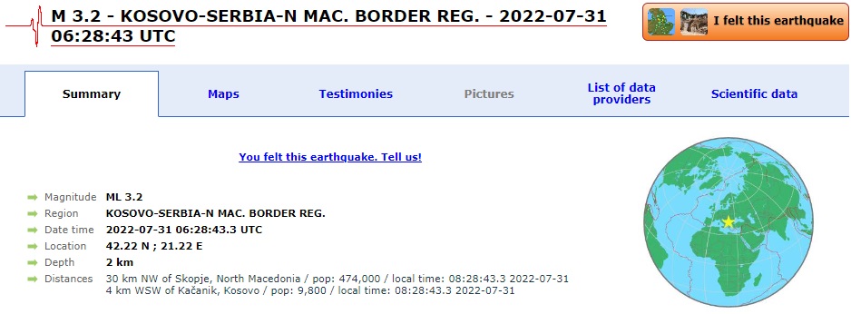 Sipas faqes sizmiologjike EMSC, lëkundjet kanë qenë me magnitudë 3.2 ballë, 53 km në veri të Prishtinës, me një thellësi prej 2 km.