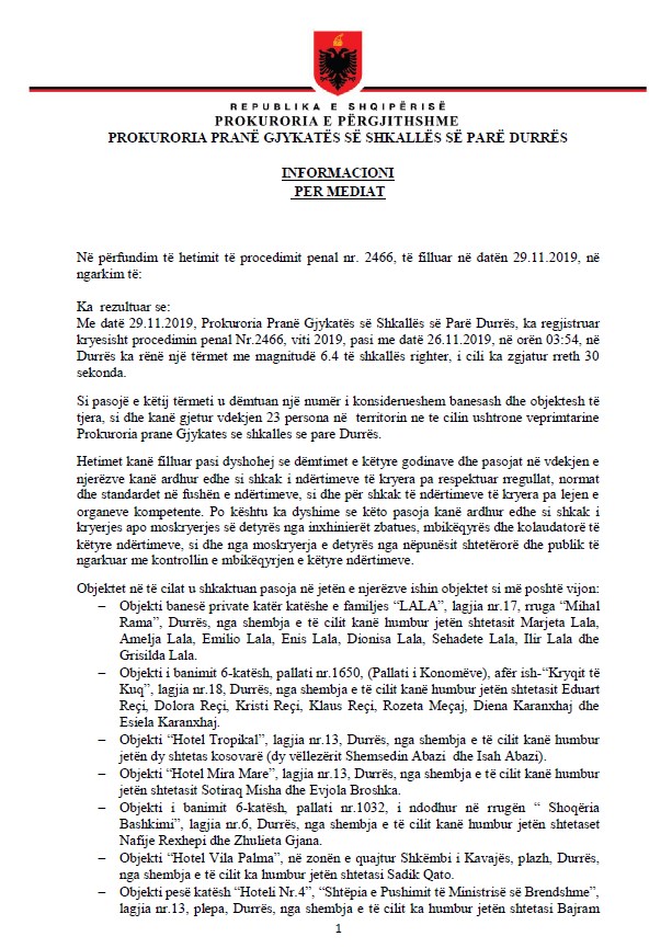 Në dokumentin e Prokurorisë së Durrësit thuhet se hetimet janë kryer për 7 ndërtime, shembja e të cilave gjatë tërmetit të 26 nëntorit u mori jetën 23 personave.