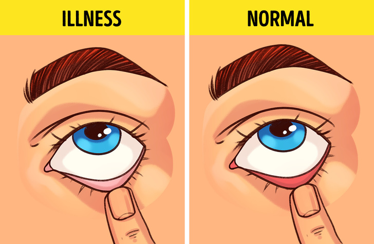 Kur të jeni para një pasqyre, tërhiqni qepallën e poshtme të syrit. Nëse ngjyra është e kuqe, gjithçka është në rregull. Nëse keni ngjyrë rozë të lehtë ose të verdhë, mund të vuani nga anemia. Anemia shkaktohet nga mungesa e hemoglobinës dhe tregon se muskujt dhe indet në trup nuk marrin oksigjen të mjaftueshëm dhe nuk mund të funksionojnë në 100%. Nëse vëreni se jeni i zbehtë, lodheni shpejt, ose merrni frymë me vështërsi, duhet të vizitoheni me patjetër tek një mjek