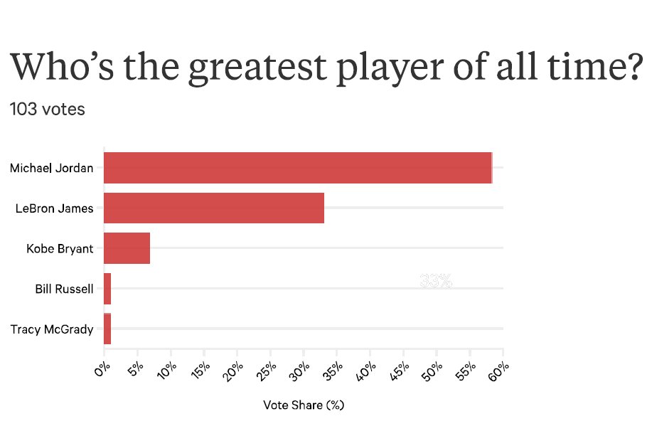 Rreth 58.3 për qind e lojtarëve në një sondazh anonim votuan për të dhe e shpallën basketbollistin më të mirë të të gjitha kohërave.