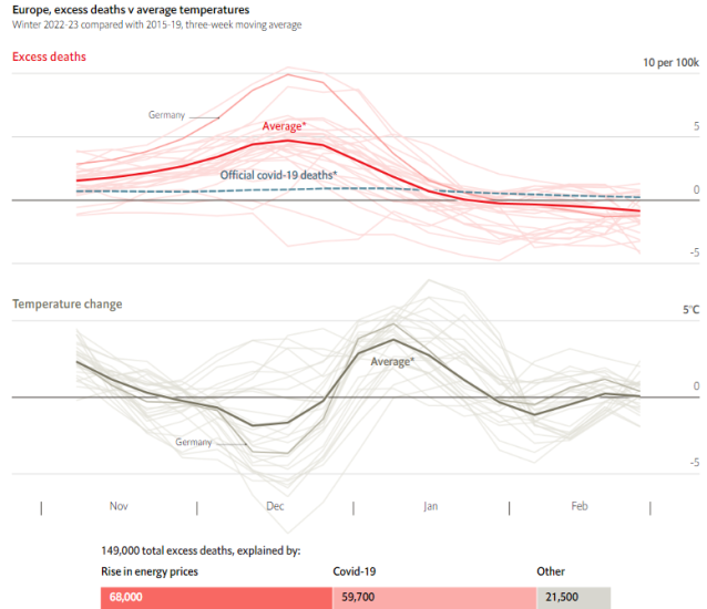Për të vlerësuar se si vdekjet dimrin e kaluar krahasohen me ato të mëparshme, The Economist përdor një masë të zakonshme të vdekshmërisë: vdekjet e tepërta. Duke krahasuar vdekjet aktuale me numrin që mund të prisnin duke pasur parasysh vdekshmërinë në të njëjtat javë të 2015-19, zbuluan se vdekjet në të gjithë Europën ishin më të larta se sa pritej. Në 28 vende europiane që hetuan, pati 149.000 vdekje të tepërta midis nëntorit 2022 dhe shkurtit 2023, ekuivalente me një rritje prej 7.8%.