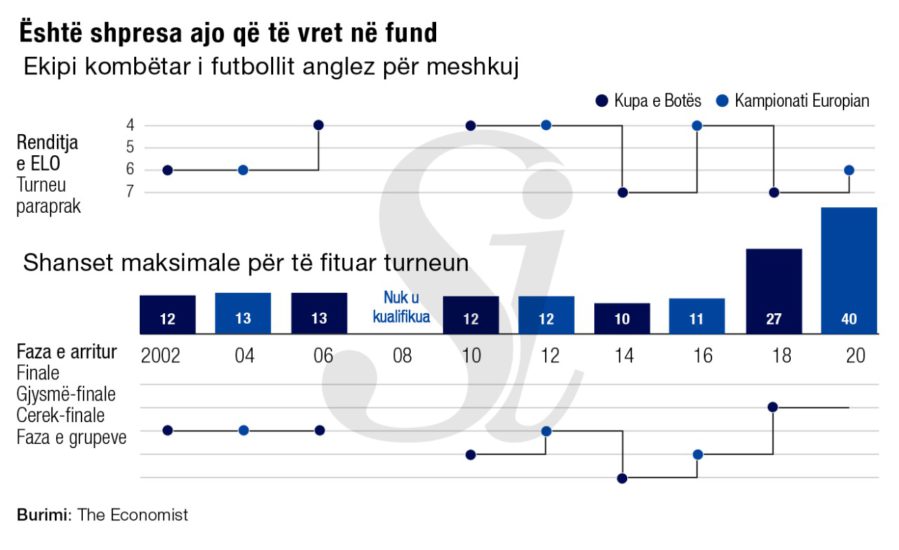 Sipas tregjeve të basteve, asnjëherë në historinë e fundit ekipi i futbollit në Angli nuk ka pasur një shans më të mirë për të fituar një turne të madh por megjithatë parashikimet e The Economist vlerësojnë se finaliste do të jetë Italia.