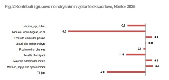 Në nëntor 2025, importet ranë me 3% krahasuar me të njëjtën periudhë të vitit të kaluar. Rënien e kanë nxitur kryesisht grupet “Makineri, pajisje dhe pjesë këmbimi” me -1.5 pikë përqindje dhe “Materiale ndërtimi dhe metale” me -0.8 pikë përqindje. Ndërkohë, grupet që dhanë ndikim pozitiv ishin “Ushqime, pije, duhan” me +1.1 pikë përqindje dhe “Prodhime druri dhe letre” me +0.3 pikë përqindje.