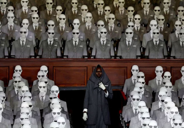 Modelët ishin të rrethuar nga manekinë ngjyrë gri dhe me syze dielli.