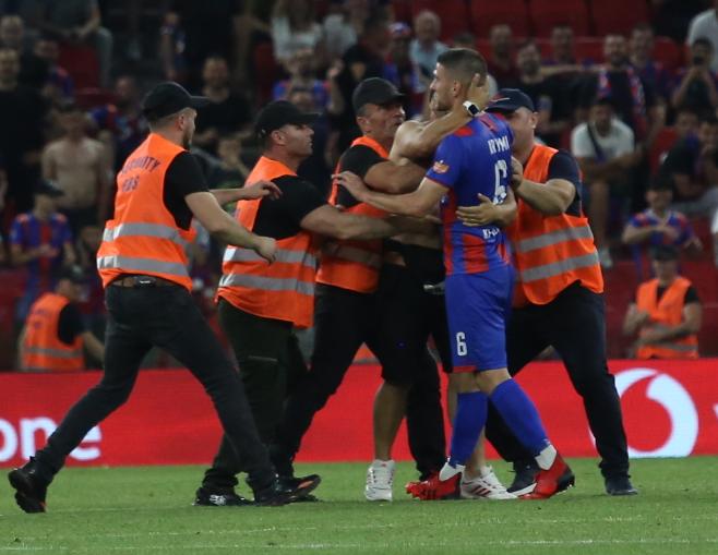 Stjuardët në stadium duket se janë gjendur të papërgatitur. Ata nuk kanë mundur tan dalin vrullin e tifozit të Vllaznisë. Ai ka përqafuar mesfushorin Ardit Krymi, i cili do të largohet jashtë vendit pas shumë vitesh te Vllaznia.