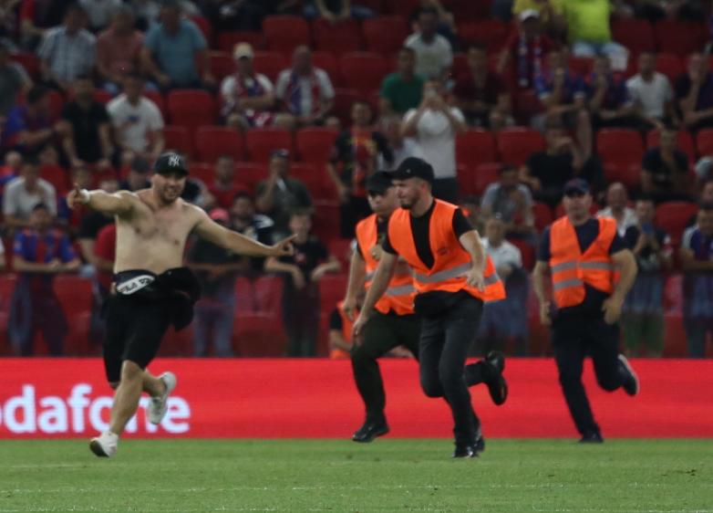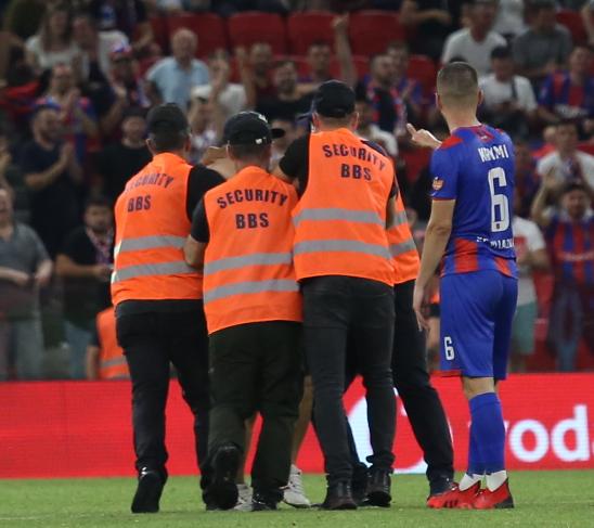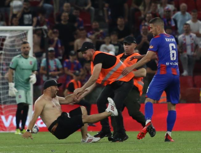 Një tifoz shkodran ka arritur t’u shpëtojë forcave të sigurisë gjatë finales së sotme të Kupës, Vllaznia-Laçi. Ai ka shkuar me vrap deri në mes të fushës, ku ka takuar lojtarin Ardit Krymi.