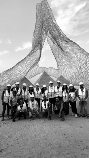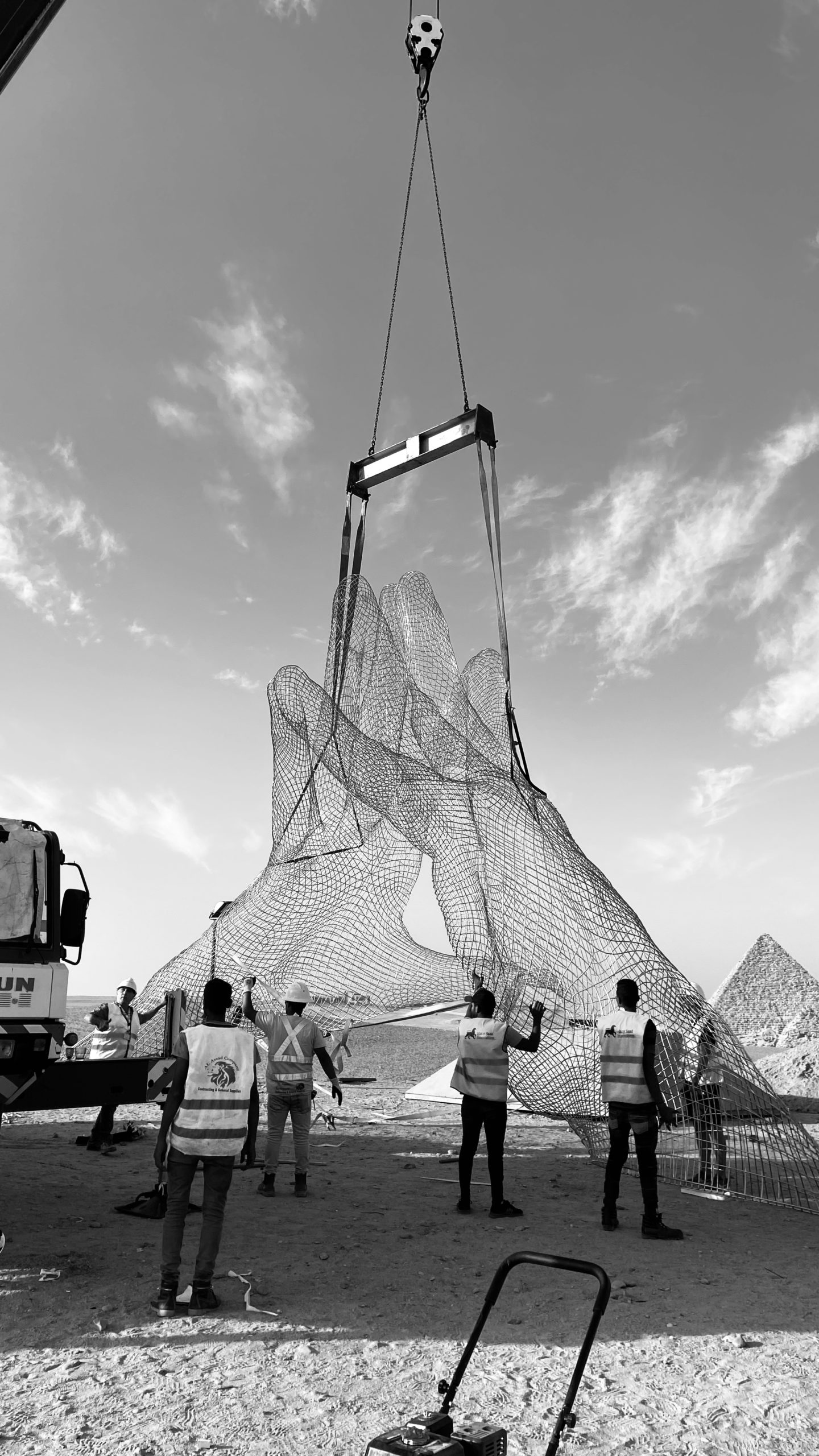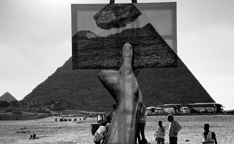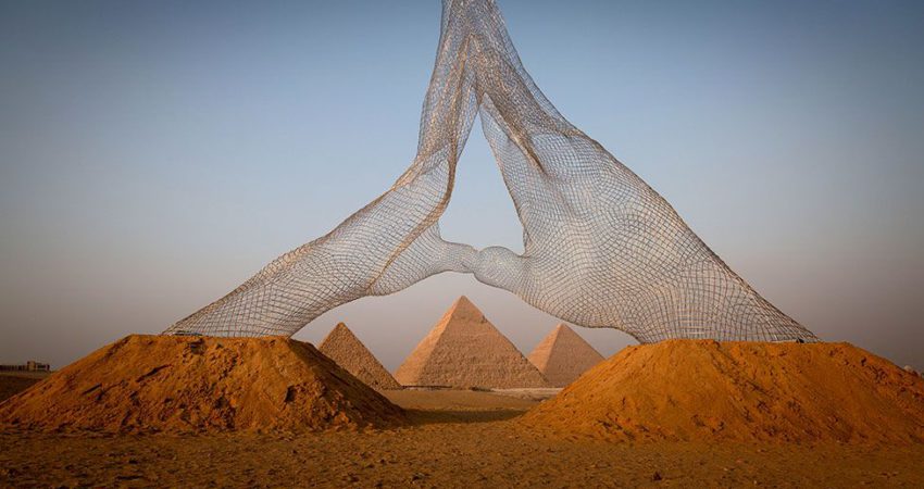 Një instalacion i titulluar “Together”, nga skulptori Lorenzo Quinn, shfaqet pranë Piramidës së Madhe të Gizës në Kajro. Instalacioni ishte pjesë e ekspozitës, “Forever Is Now”, që në përgjithësi paraqet skulptura rreth rrafshnaltës së Gizës, me vepra të artistëve bashkëkohorë egjiptianë dhe të huaj./Reuters/