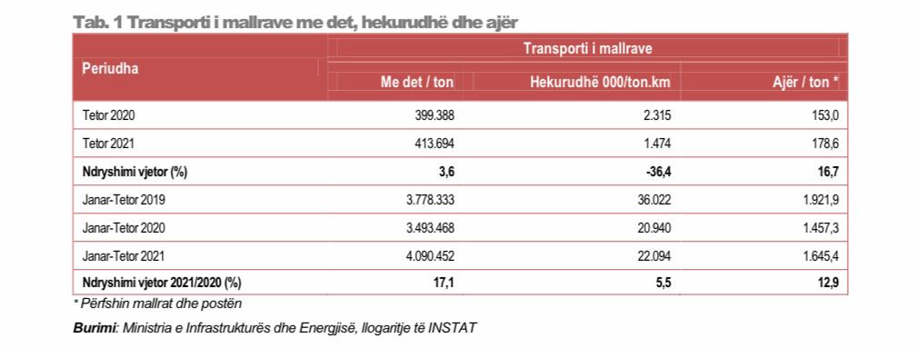 Në Tetor 2021 mallrat e importuara me det zënë 46.7 %, me rrugë 43.4 % dhe me ajër 3.1 %. Mallrat e importuara me rrugë në tetor 2021 janë rritur me 14.0 %, krahasuar me tetor 2020.