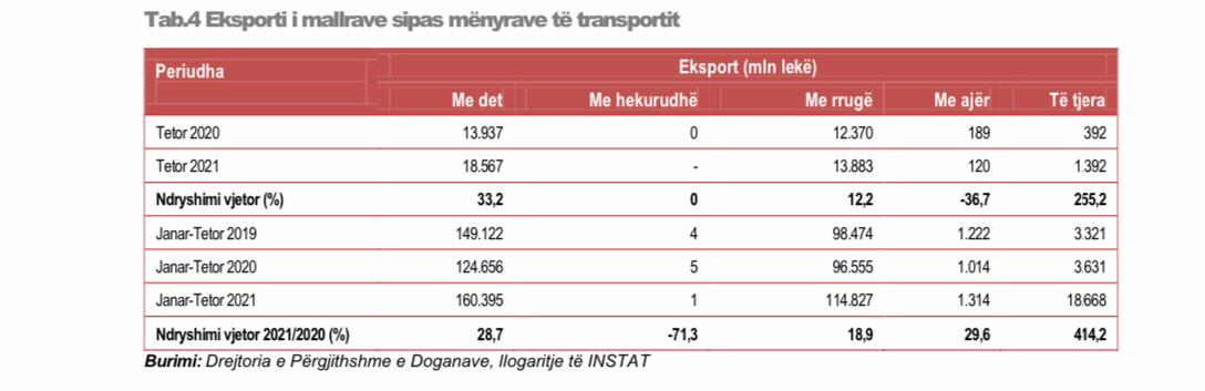 Në tetor 2021, mallrat e eksportuara me det zënë 54.7 %, me rrugë 40.9 % dhe me ajër 0.4 %. Mallrat e eksportuara me rrugë në tetor 2021 janë rritur me 12.2 %, krahasuar me tetorin e vitit 2020.