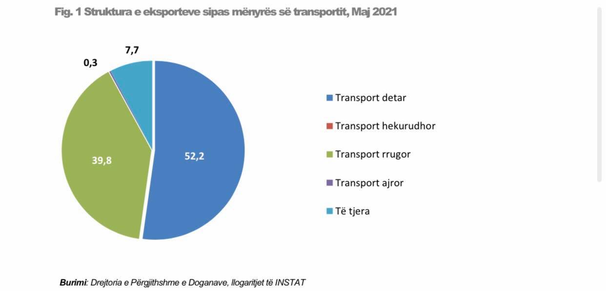 Eksportet e mallrave në maj 2021, mallrat e eksportuara me det zënë 52,2 %, me rrugë 39,8 % dhe me ajër 0,3 %.