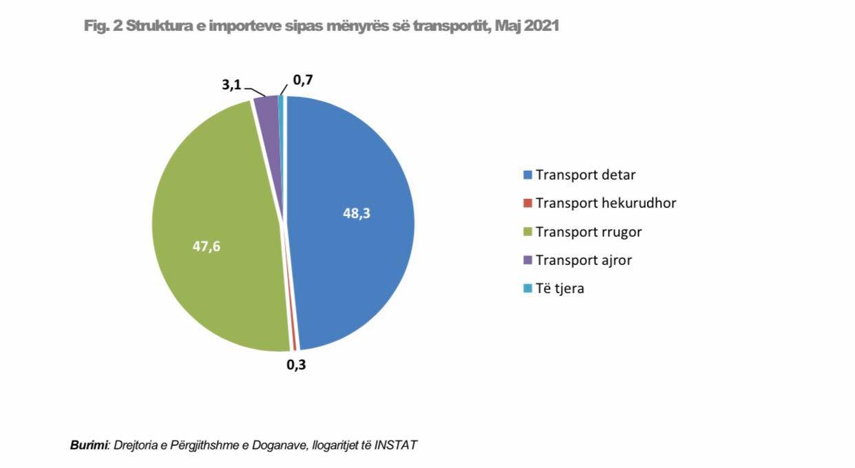 Në pesëmujorin e parë të vitit 2021, mallrat e importuara me det zënë 46,7 %, me rrugë 47,9 % dhe me ajër 3,2 %