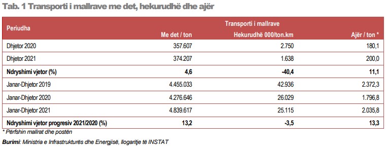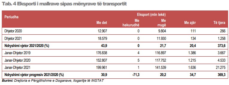 Në Dhjetor 2021, mallrat e eksportuara me det zënë 58.2%, me rrugë 37.4% dhe me ajër 0.4%. Mallrat e eksportuara me rrugë në Dhjetor 2021 janë rritur me 21.7%, krahasuar me Dhjetor 2020.