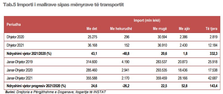 Në Dhjetor 2021 mallrat e importuara me rrugë zënë 42.0%, me det 41.2% dhe me ajër 2.8%. Mallrat e importuara me rrugë në Dhjetor 2021 janë rritur me 20.6%, krahasuar me Dhjetor 2020.