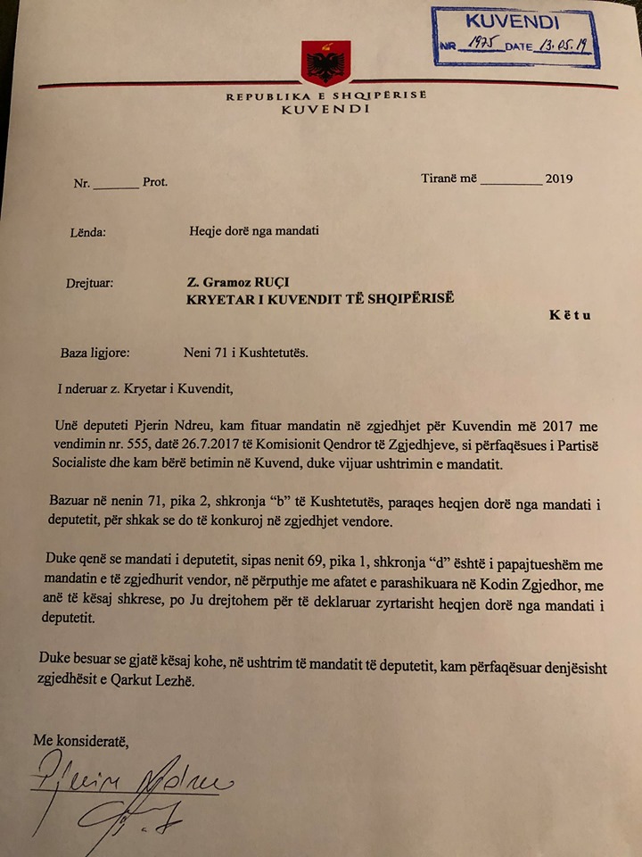 Deputeti i PS-së, Pjerin Ndreu, ka dorëzuar sot mandatin e deputetit. Me anë të një letre drejtuar kreut të Kuvendit, Gramoz Ruçi, Ndreu shkruan se jep dorëheqjen nga mandati i deputetit për shkak të garës në zgjedhjet vendore të 30 qershorit.