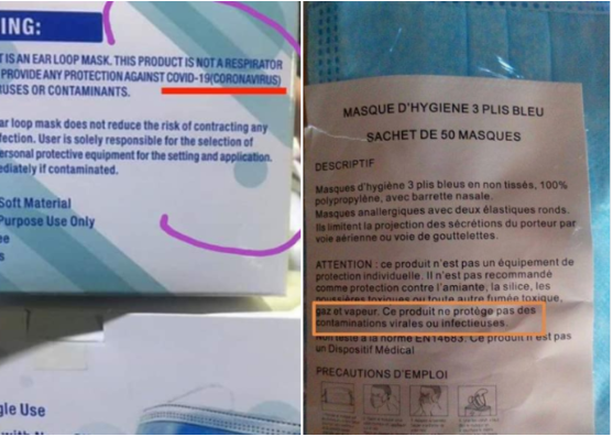 “Maska nuk mbron kundër infeksioneve ose viruseve”, denoncon një mesazh i postuar në Facebook, ilustruar nga fotografia e një pakete të maskave “. Në të thuhet: “Ky produkt nuk mbron nga ndotjet virale ose infektive. “