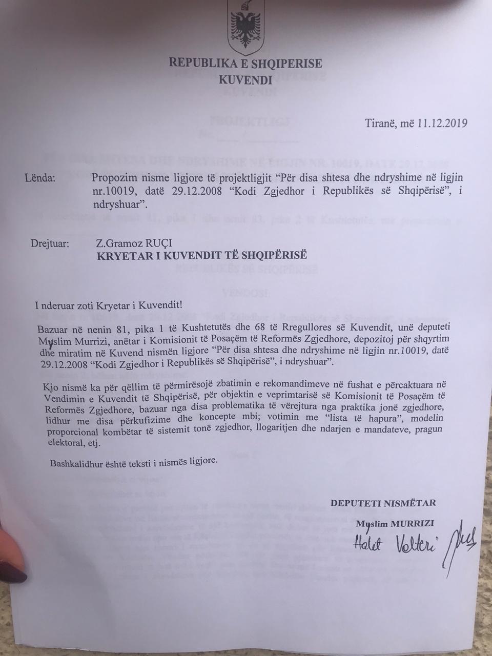 Dy nismat e tjera janë po nga deputetët e opozitës parlamentare. Myslim Murrizi dhe Halit Valteri më 19 dhjetor depozituan në Kuvend nismën për ndryshimin e sistemit. Propozimi i tyre synon një zonë zgjedhore, me 140 deputetë. Partitë duhet të paraqesin 154 kandidatë për deputetë, ku zgjedhësit të kenë të drejtën e preferencës së tyre.