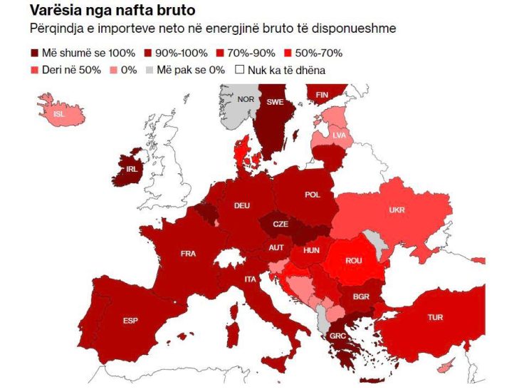 Vendet e Eurozonës janë shumë të varura nga importet për naftën e tyre. Me pothuajse asnjë furnizim vendor të papërpunuar, secila nga pesë ekonomitë më të mëdha të bllokut të monedhës – Gjermania, Franca, Italia, Spanja dhe Holanda – janë të paktën 90% të varura nga blerjet e huaja për të drejtuar rafineritë.