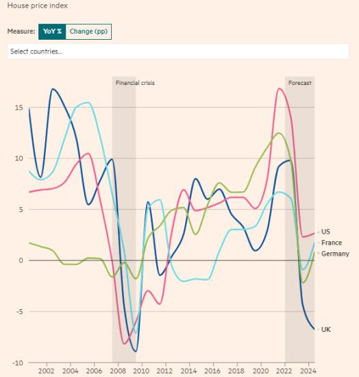 Në Britani, tregu i kredisë për banesa u trondit nga kriza politike që solli Liz Truss me propozimin e saj për shkuritm taksash në qeverinë e saj jetëshkurtër. Tregjet u qetësuan pak me vendosjen e Rishi Sunak si kryeministër, por prap norma bazë e interesit pritet të shkojë deri në 4.6%. Fondacioni The Resolution, parashikon se deri në fund të 2023-shit, një këst mujor i kredisë në Britani do të shkojë mbi 5 mijë paund. Si rezultat, pritet një rënie e çmimit 4.4% sipas Oxford Economics.