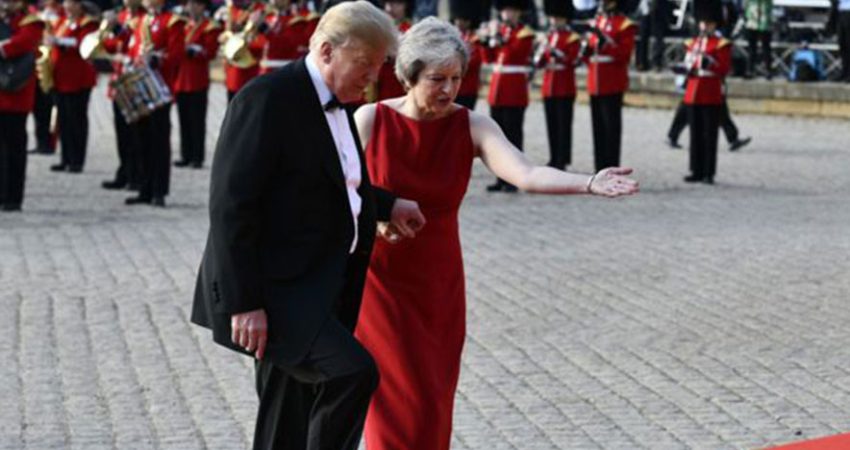 Presidenti dhe bashkëshortja e tij u pritën me një ceremoni tapeti të kuq në pallatin “Blenheim”, në Oxfordshire”, pasditen e së enjtes. Ata ishin duke darkuar me Mayn kur doli lajmi për intervistën e tij me gazetën britanike, e cila – sipas tij, – ishte bërë teksa gjendej në Bruksel.
