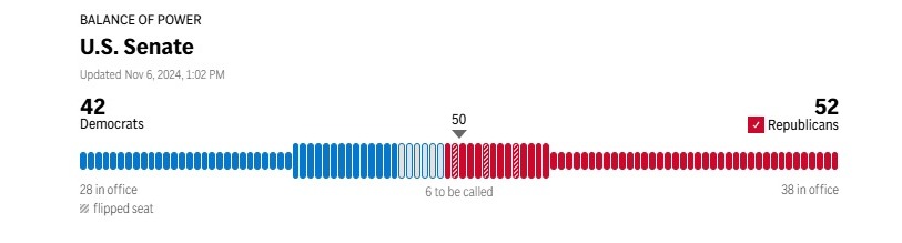 Nga Gazeta ‘Si’- Republikanët fituan kontrollin e Senatit të SHBA-së ndërsa beteja për Dhomën e Përfaqësuesve po vazhdon. Kjo i jep Trumpit një qendër të madhe pushteti në Uashington dhe një rol udhëheqës në konfirmimin e kabinetit të presidentit të ardhshëm, si dhe çdo gjykatës të Gjykatës së Lartë nëse ka një vend vakant.