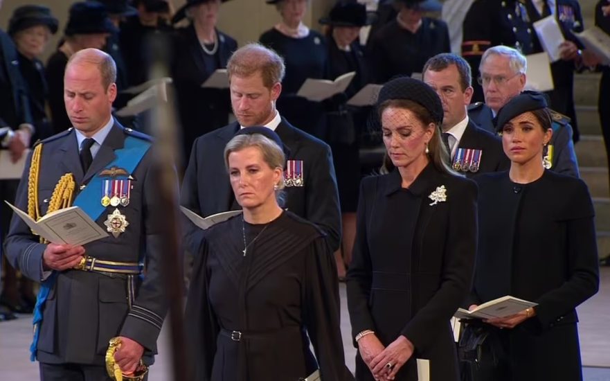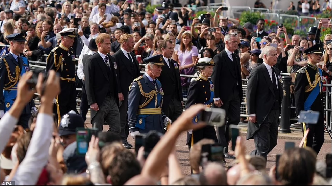 Trupi i monarkes më jetëgjatë të Britanisë së Madhe, Elisabeth II është zhvendosur nga Pallati Buckingham në Westminister Hall. Pas arkëmortit të mbretëreshës ecën së bashku Mbreti Charles III, Princi William dhe Princi Harry në shenjë nderimi.