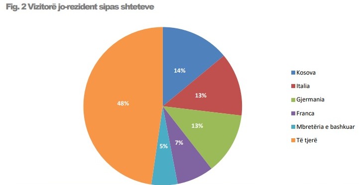 Sa i përket origjinës së vizitorëve jo-rezidentë, pjesa më e madhe vjen nga rajoni dhe Europa. Kosova përbën 14% të totalit, Italia dhe Gjermania secila 13%, Franca 7% dhe Mbretëria e Bashkuar 5%. Për më tepër, 48% e vizitorëve janë nga vende të tjera, duke reflektuar një zgjerim të pritur të turizmit hyrës nga tregjet ndërkombëtare.