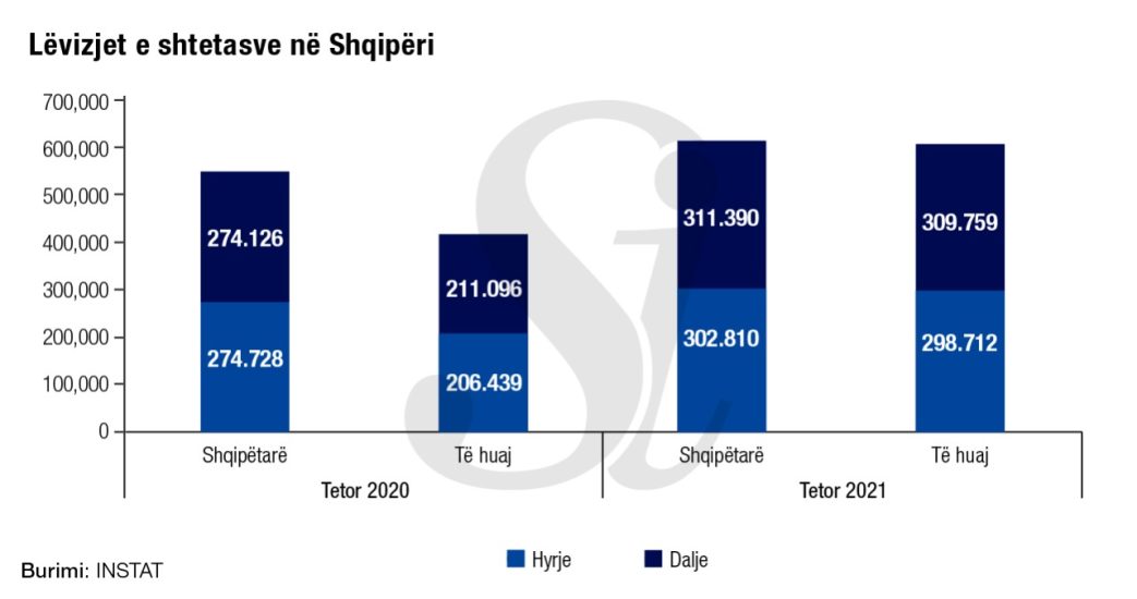 Në raport me vitin 2020 INSTAT raportoi se numri i shtetasve të huaj të hyrë në Shqipëri gjatë dhjetëmujorit të 2021, është 5.177.116, duke u rritur me 2.2 herë, në krahasim me të njëjtën periudhë të vitit 2020 .
