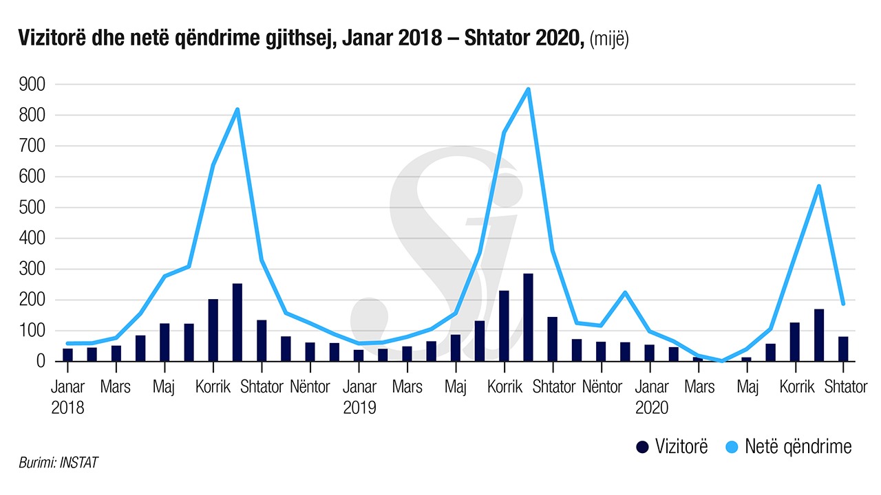 Në të njëjtën periudhë, numri i vizitorëve për turizëm në vend është ulur me 43,3 %, në krahasim me tremujorin e tretë 2019; numri i netë qëndrimeve gjithsej është ulur me 44,9 %, në krahasim me tremujorin e tretë 2019; numri i netë qëndrimeve për tremujorin e tretë 2020 ndjek të njëjtin trend me numrin e vizitorëve