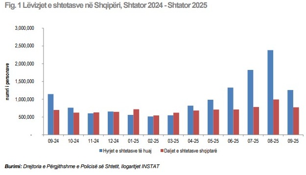 Nga Gazeta ‘SI’ – 1.96 milionë hyrje u regjistruan në Shqipëri gjatë muajit shtator, me një rritje vjetore prej 9.5%. Shumica e tyre ishin shtetas të huaj, 1.25 milionë, 9.9% më shumë se një vit më parë. Shqiptarë ishin 705 mijë, me rritje 8.9%.