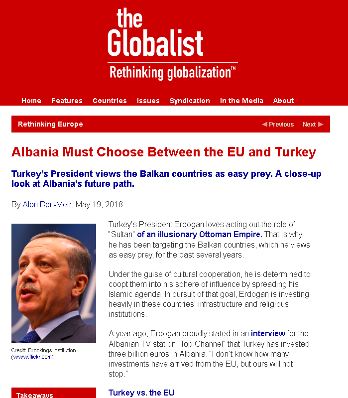 “Qëllimi i Erdoganit është të sigurojë një dozë të vogël zhvillimi ekonomik në Shqipëri, derisa vendi më në fund i nënshtrohet ndikimit të tij. Megjithatë, nëse Shqipëria po synon të shkojë drejt Bashkimit Europian, siç thotë zyrtarisht, duhet të jetë e kujdesshme për atë që dëshiron. Nuk duhet të lejojë Erdogan që të dominojë vendin. BE nuk do të pranojë asnjë anëtar të ri në Bashkimin Europian që është thellësisht i lidhur me Erdogan, veçanërisht tani që dëshira e tij e zhveshur për të dominuar në Ballkan është e qartë për të gjithë”, thuhet në analizën e The Global List.