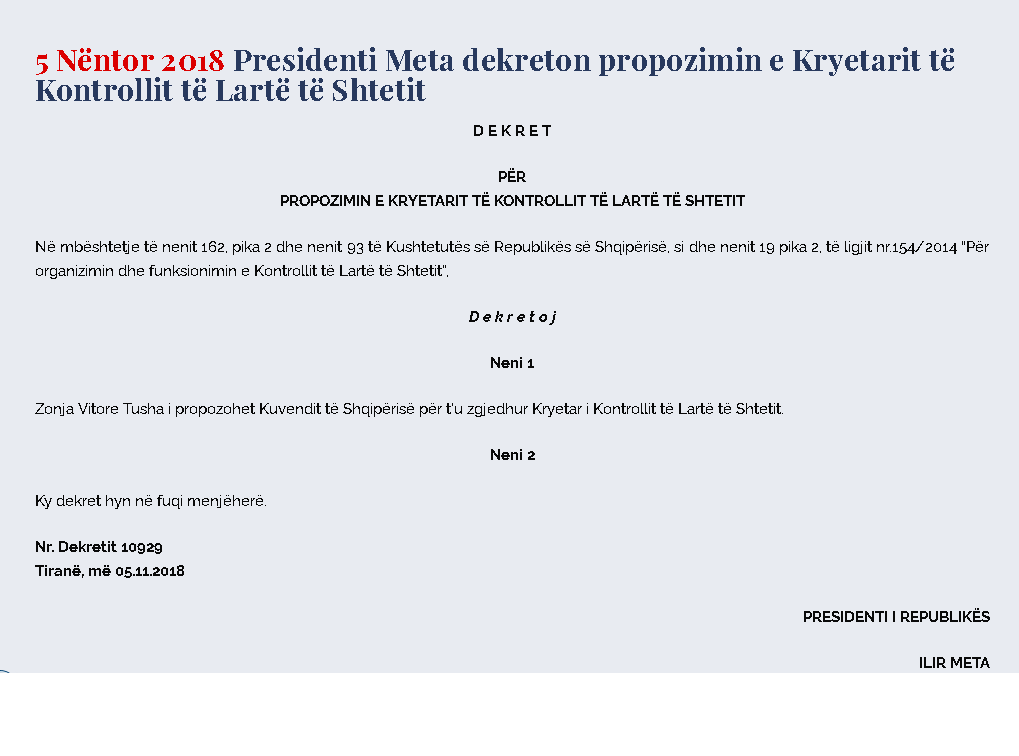 Kur Lleshi tashmë është një ministër i Brendshëm i komanduar, “lufta” mes Presidentit dhe Qeverisë dhe mazhorancës socialiste do të fokusohet te dekreti i Metës për emërimin e Vitore Tushës në postin e kreut të KLSH-së.