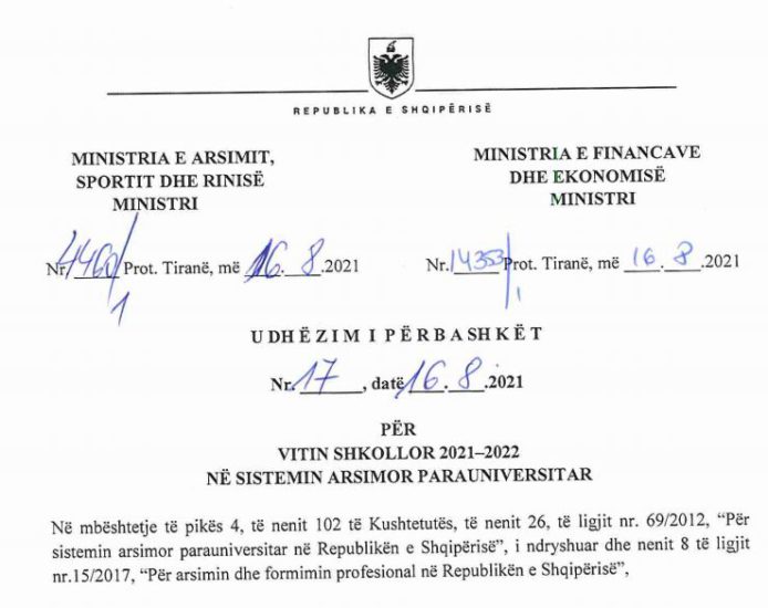 Ministrja e Arsimit, Sportit dhe Rinisë Evis Kushi dhe Ministrja e Financave dhe Ekonomisë Anila Denaj firmosën “Udhëzimin për vitin e ri shkollor 2021-2022 në sistemin para universitar”.