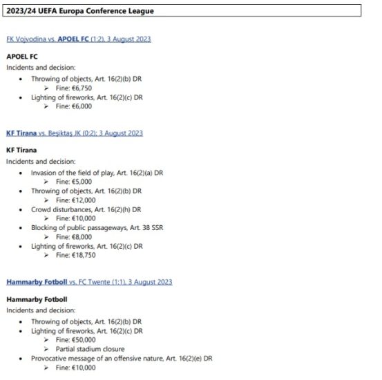 Përplasja e tifozërive para ndeshjes, futja e tifozëve në fushë, hedhja e sendeve dhe fishekzjarreve në fushë, si dhe bllokimi i kalimeve kanë bërë që UEFA të vendosë për këtë gjobë të majme ndaj klubit të Tiranës. Vetëm për hedhjen e fishekzjarreve gjoba ishte 18.750 euro.