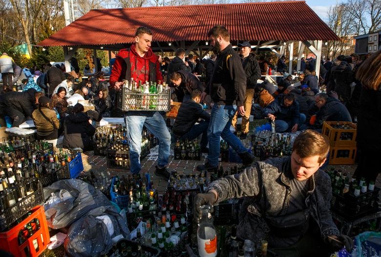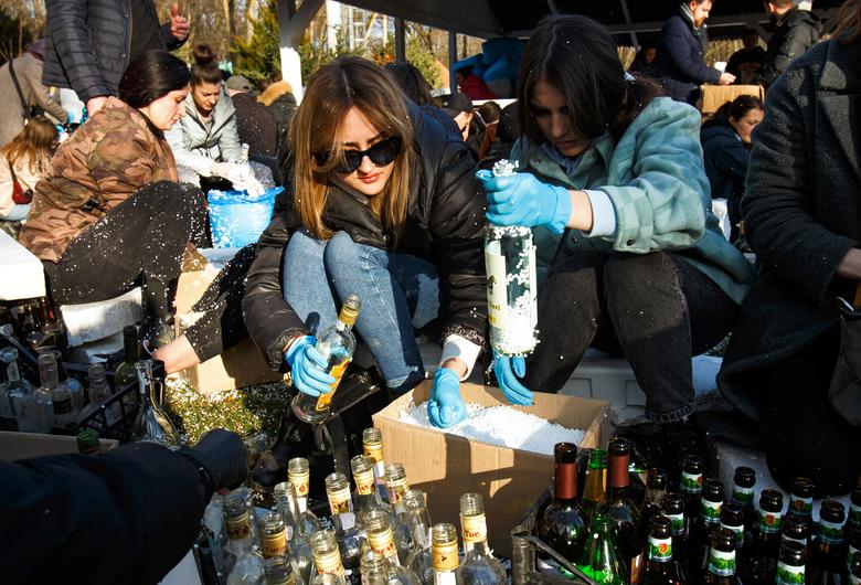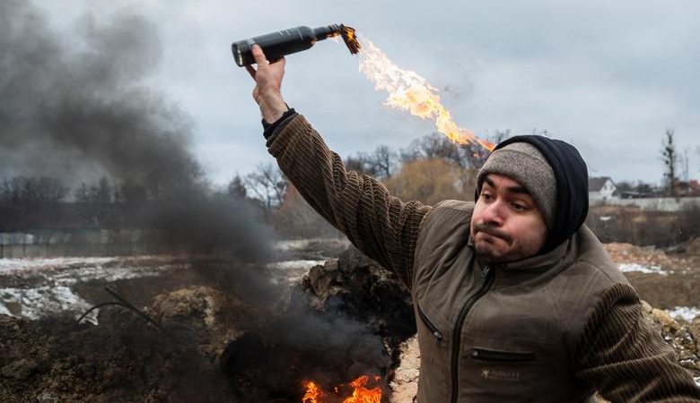 Civilët stërviten për të hedhur kokteje molotov për të mbrojtur qytetin, ndërsa pushtimi rus i Ukrainës vazhdon, në Zhytomyr, Ukrainë.