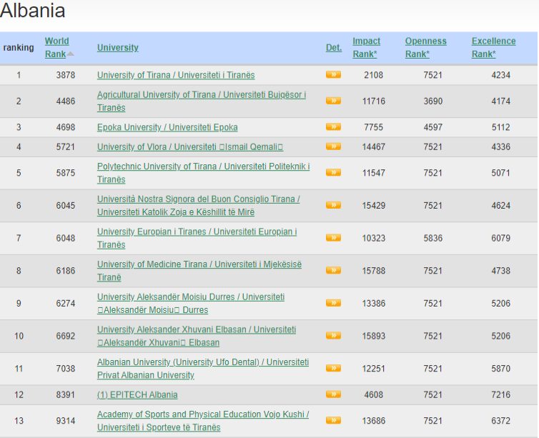 Nga Gazeta ‘SI’- Në raportin e vitit 2022, Universiteti i Tiranës u rendit në vendin e 3.878-të nga më shumë se 31 mijë universitete në të gjithë botën. Ky është vlerësimi më i lartë ndër universitetet tjera në vend, por më i ulëti në rajon dhe në vendet e fundit në Europë.