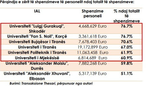 Universiteti me shpenzimet më të larta rezulton ai i Tiranës me një kosto vjetore 28.6 mln euro, nga ku 21 mln kanë shkuar për personelin dhe honorare. Politekniku mban vendin e dytë për shpenzime, 17.8 mln euro, ku 13 mln euro ka kushtuar vetëm stafi me pagat dhe honoraret.
