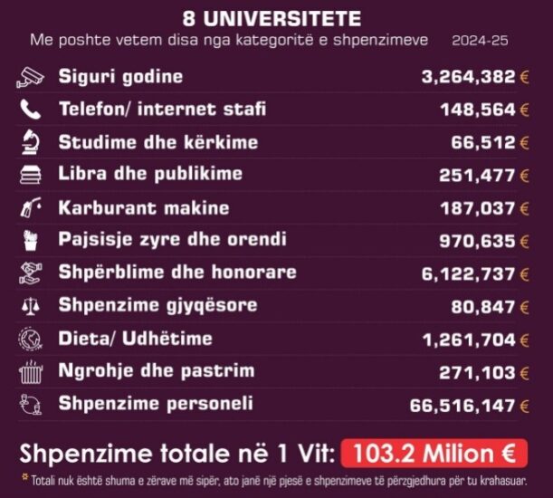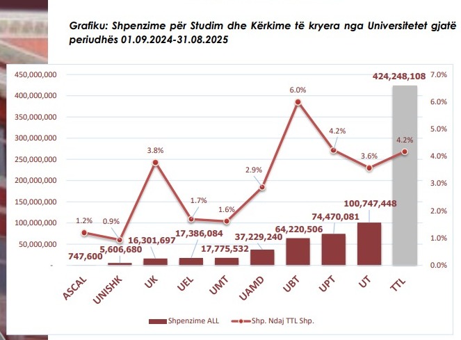 Vetëm 4.2% e shpenzimeve në 8 universiteteve me te medha te vendit janë investuar në kërkim shkencor nga buxheti i universiteteve. Sa i përket shpenzimeve për dieta dhe udhëtime, në krye të listës qëndron Universiteti i Tiranës, me një shumë prej rreth 331 mijë euro.