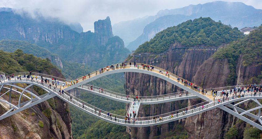 Ura, e cila është e gjatë 328ft (100m) dhe shtrihet në luginën Shenxianju në provincën Zhejiang, në të vërtetë përbëhet nga tre ura me valë dhe një pjesë e kuvertës së saj është bërë nga qelqi transparent.
