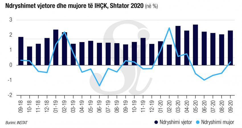Ndryshimi vjetor i matur nga Indeksi i Harmonizuar i Çmimeve të Konsumit në muajin Shtator 2020 është 2,3 %.