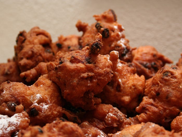 Përkthehet, topat e vajosur. Topa prej mielli që skuqen në vaj dhe mbulohen me sheqer pluhur dhe mbushen me fruta të thata. Sipas legjendës, ato që i hanë i shpëtojnë dorës së Perchta, një zot pagan që pret stomakun e të rebeluarëve. Atyre që hanë oliebollen nuk i pret dot sepse shpata rrëshqet nga vaji.