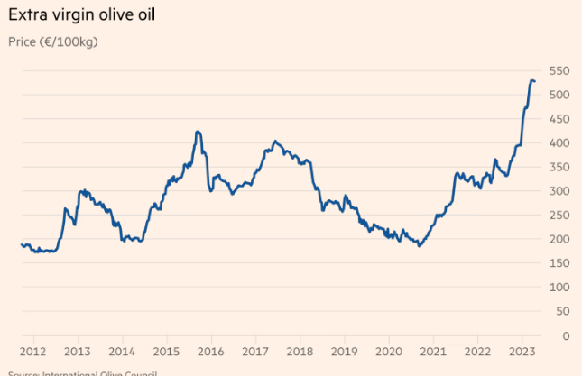 Rritja e çmimeve ka qenë e mprehtë. Dhjetorin e kaluar, vaji ekstra i virgjër – lloji më i shtrenjtë, i bërë nga ullinj të shtypur në të ftohtë – arriti në 5.5 euro për litër në Itali. Ky është 50% më lart në krahasim me një vit më parë dhe është rreth dyfishi i çmimit në vitin 2020. Vajrat e tjerë të ullirit janë rritur edhe më shumë. Vaji i ullirit është një element kryesor në vendet prodhuese.