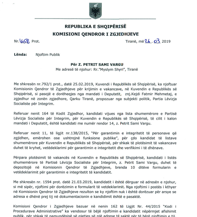 Komisioni Qendror i Zgjedhjeve vijon të ftojë kandidatët e listës për deputetë nga Partia Demokratike dhe Lëvizja Socialiste për Integrim. Kështu thirrjet më të fundit kanë shkuar në adresë të disa kandidatëve si Fatmir Guda, Prel Gjoni, Enri Çeno dhe Petrit Vargu. Kështu Guda ftohet të zëvendësojë mandatin e Hekuran Hoxhollit të PD-së në Korçë, Gjoni atë të deputetit të PD-së, Romeo Gurakuqi të PD në Shkodër, ndërsa Vargu të Kejdi Mehmetaj të LSI në Tiranë dhe Çeno të Oerd Bylykbashit të PD-së në Durrës.