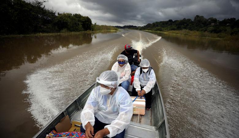 Punonjësit shëndetësorë udhëtojnë me një varkë përgjatë brigjeve të lumit Solimoes, ku jetojnë Ribeirinhos (banorë të lumenjve), për të shpërndarë vaksinën AstraZeneca në Brazil.\Reuters