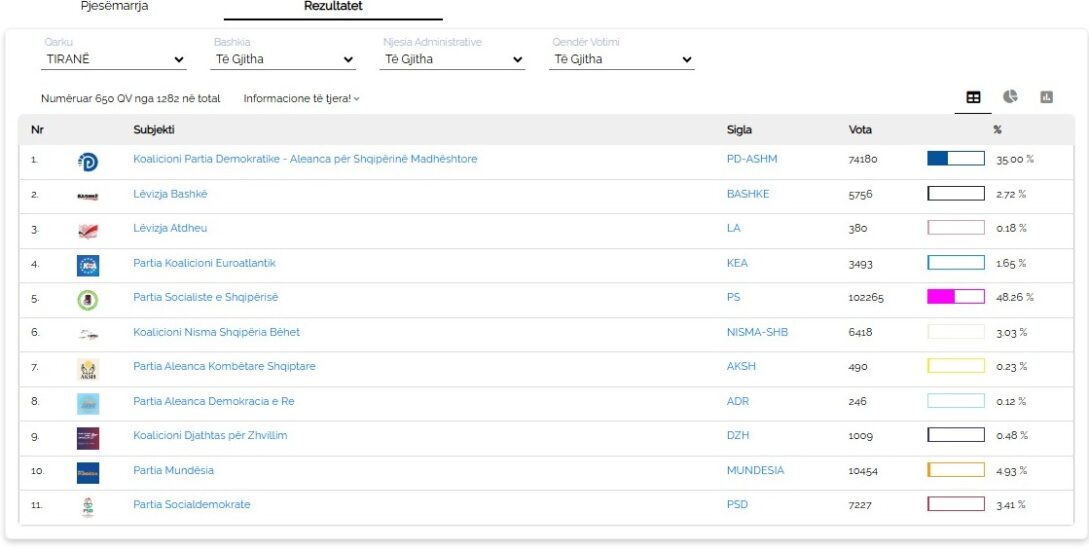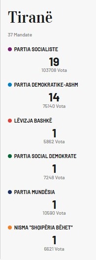 Nga Gazeta ‘SI’ – Në qarkun e Tiranës janë numëruar 650 qendra votimi nga 1.282 në total, ku kryeson Partia Socialiste me 19 mandate. PS numëron më shumë se 100 mijë vota deri më tani.