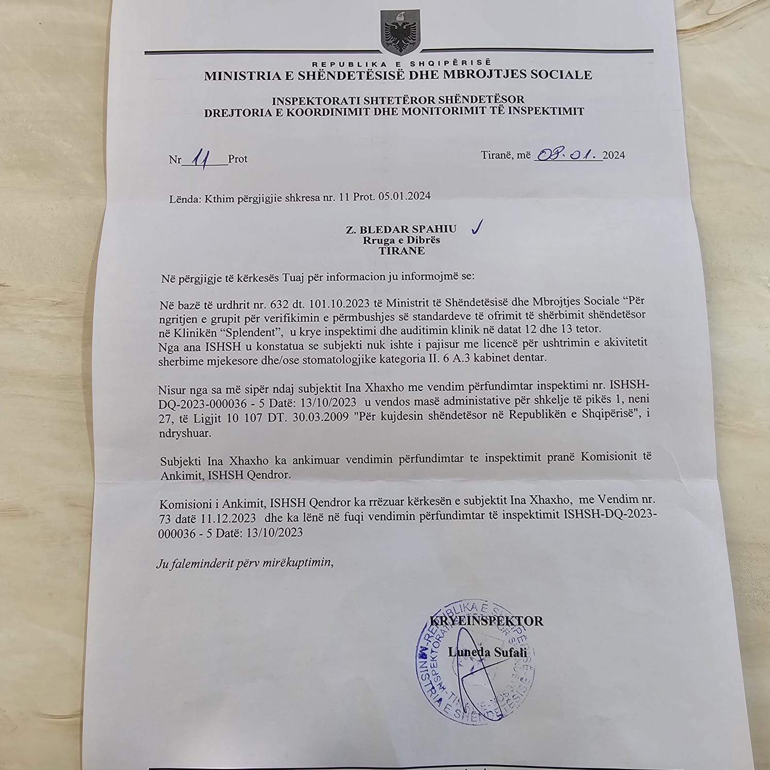 Ata kanë paraqitur në Prokurori rezultatet e një inspektimi që është bërë nga Inspektoriati Shtetëtor Shëndetësor menjëherë pas ngjarjes, i cili ka rezultuar se subjekti në fjalë nuk ishte i pajisur me licencë për ushtrimin e aktivitetit në shërbime mjekësore dhe stomatologjike në kohën kur ka kryer ndërhyrjen.