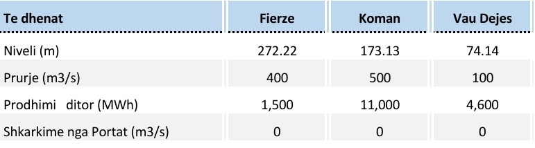Sipas të dhënave të KESH për datën 7 janar 2021, të enjten të dhënat respektive në lidhje me kaskadën e Fierzës, Komanit dhe Vaut të Dejës janë të shfaqura në tabelën e mëposhtme.